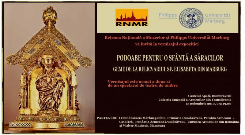 A Marburgi Árpádházi Szent Erzsébet erekjetartó a témája annak a képkiállitásnak, az Erzsébetvárosi Apafi kastélyban, melyet a Marburgi Philipps Egyetem ajánlott fel erre a célra az Erdélyi Örmény Virtuális Múzem részére.