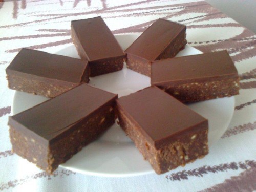 Gőz felett 2 tábla tejescsokit 2 ek. étolajjal felolvasztjuk, majd rákenjük, hűtőbe rakjuk míg a csokimáz megkeményedik rajta, és végül a tepsiben vágjuk fel.Nem kell sütőpapírt használni.