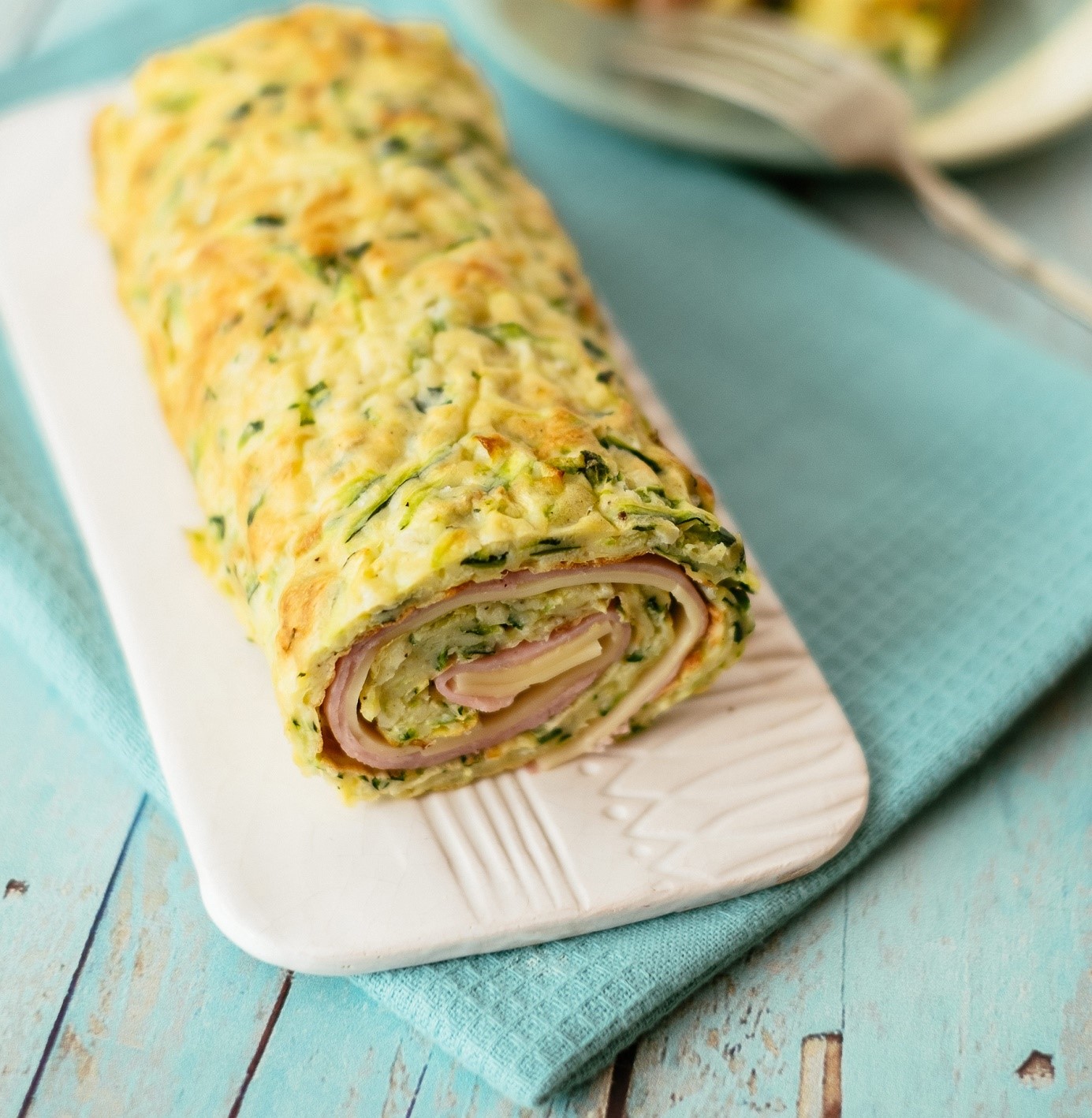 A cukkinis lapot kitekerjük, és elrendezzük rajta a sonka- és a sajtszeleteket. Ismét feltekerjük, majd felszeletelve tálaljuk.