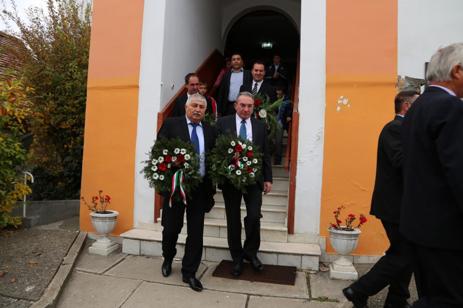 A koszorúzásra a református templom udvarán található, 1977-ben állított kopjafánál került sor, ahol Winkler Gyula, Európai Parlamenti képviselő és Balázs Béla Attila helyezte el az első koszorút, a Szeben Megyesi RMDSZ részéről. Őket követően, Orosz Csaba és Csifó Levente, a Medgyesi RMDSZ és az Erdélyi Magyar Közművelődési Egyesület Szeben Megyei Szervezetének képviseletében helyezték el koszorúikat. Végezetül Csige Sándor konzul, Magyarország Kolozsvári Főkonzulátusának képviseletében helyezte el koszorúját és hajtott fejet a hősök emlékének tiszteletére.