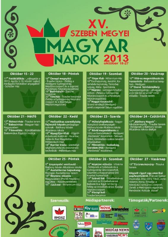 A már hagyománnyá vált rendezvénysorozat újra színesebbé kivánja varázsolni enyhe, őszi napjainkat. Igen, a Szeben Megyei Magyar Napok újra megszervezésre kerülnek 2013. október 18-27 között.