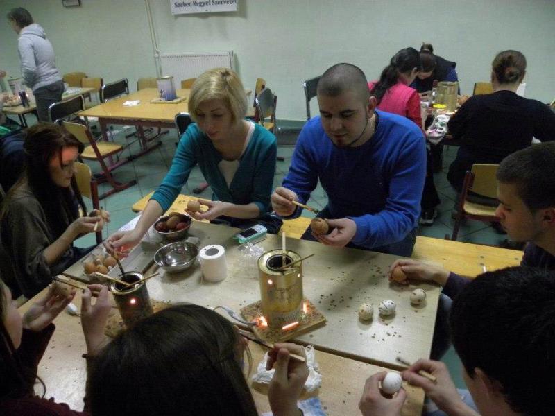 Nem feledkeztünk meg a kicsikről sem, idén is megszerveztük a Gyöngyvirág Néptánccsoporttal a húsvéti tojásfestést, hagyományos módra, viasz és kesice használatával.