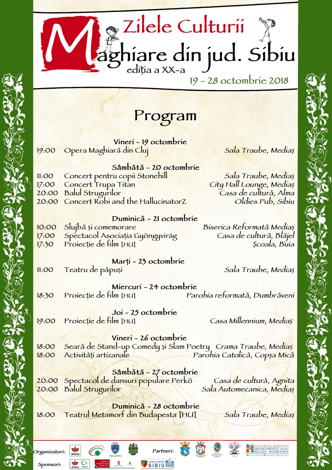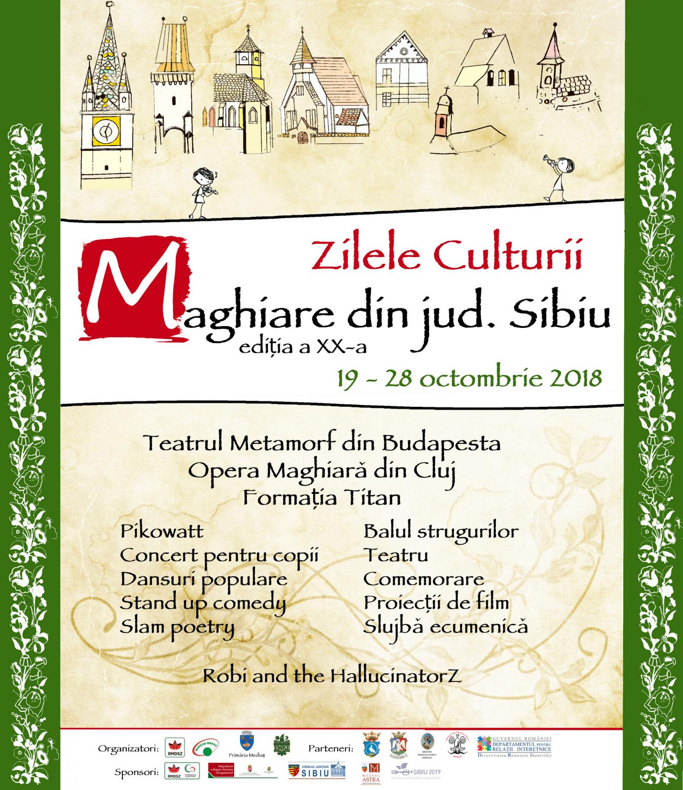 În perioada 19-28 octombrie, revenim cu a douăzecea ediție a Zilelor Culturii Maghiare din județul Sibiu. Anul acesta sărbătorim douăzeci de ani, de când toamna, pentru comunitatea maghiară din județ înseamnă evenimente și festivități.