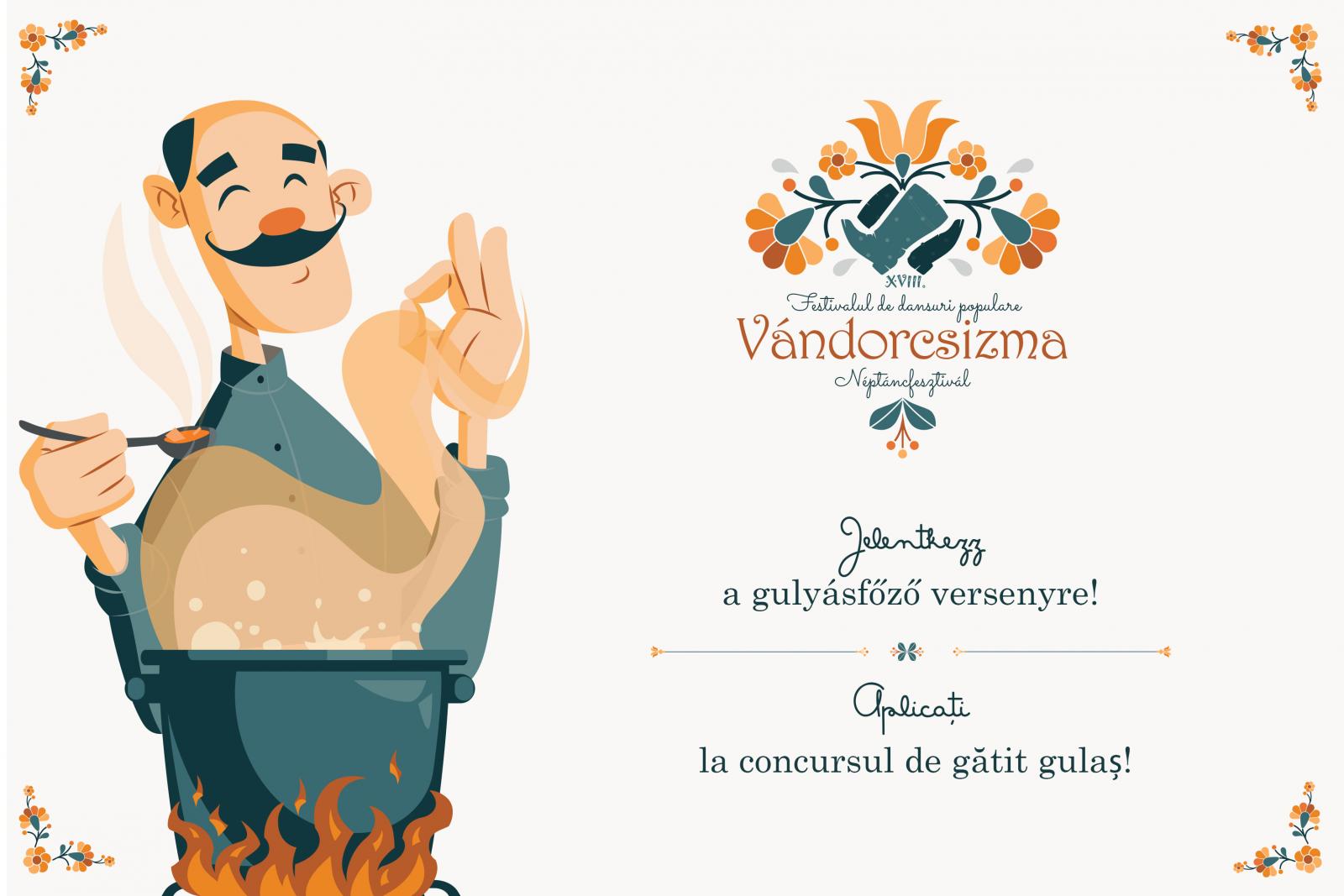 În cadrul Festivalului „Vándorcsizma” ediția a XVIII-a organizăm concurs de gătit gulaș. Așteptăm înscrierile echipelor formate din 3-6 persoane, cu ceaun între 30 și 100 de litrii, până la data de 10 septembrie 2021.
