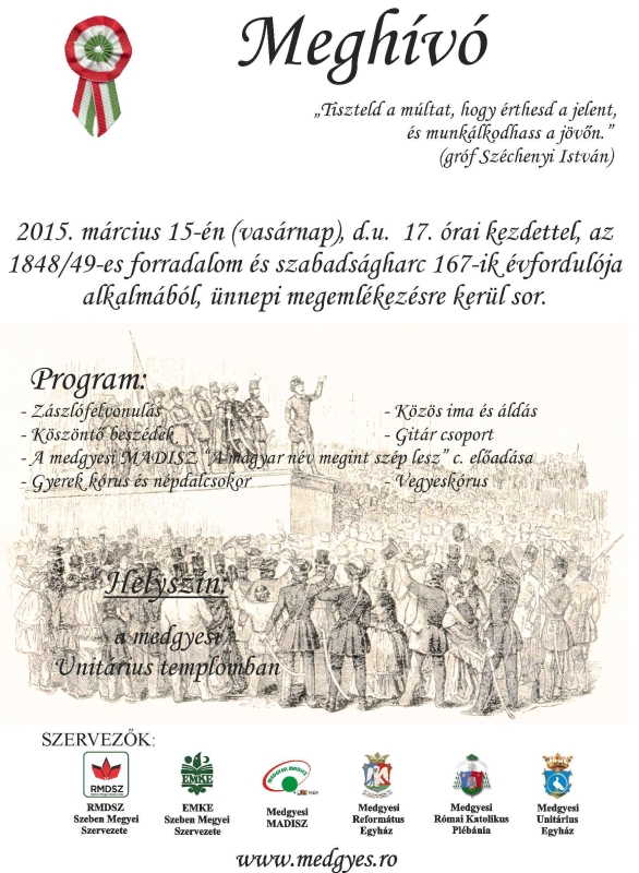Medgyesen az ünnepi megemlékezést – immár hagyományosan az EMKE, az RMDSZ, a MADISZ és a történelmi egyházak társszervezésében –, a helyi unitárius templomban tartják 2015. március 15-én, vasárnap délután 17 órától. A megemlékezést követően szeretetvendégségre várunk minden kedves résztvevőt a Millenium-Ház nagytermében.