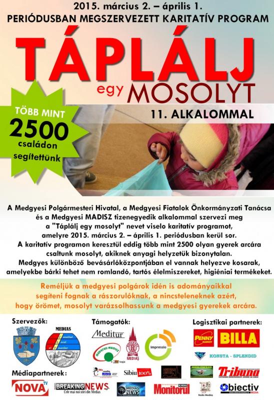 A Medgyesi Polgármesteri Hivatal, a Medgyesi Fiatalok Önkormányzati Tanácsa és a Medgyesi MADISZ tizenegyedik alkalommal szervezi meg a „Táplálj egy mosolyt” nevet viselő karitatív programot, amelyre a 2015. március 2. – 2015. április 1. periódusban kerül sor. Eddig a karitatív programon keresztül több mind 2500 mosolyt szereztünk olyan gyerek arcára csaltunk mosolyt, akiknek anyagi helyzetük bizonytalan.