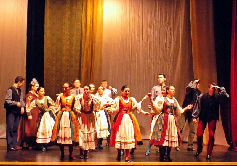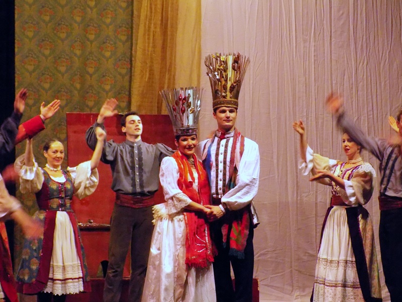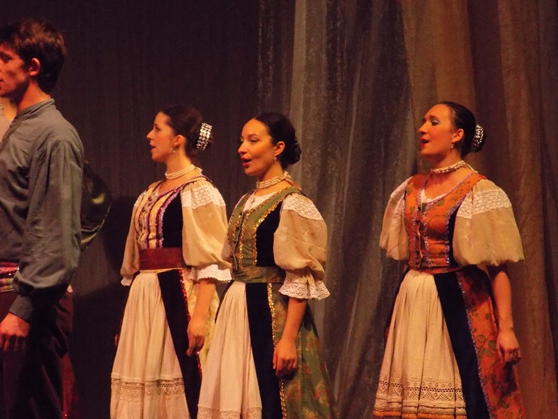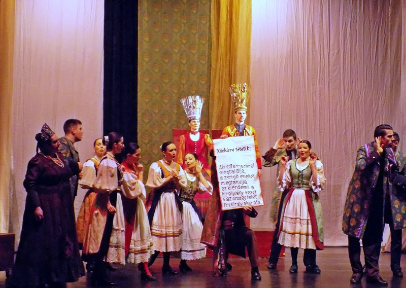 A lányok szemet gyönyörködtető ruhákban, csipkés brokát viseletben táncoltak, tréfálkoztak, csillogtak-villogtak a színpadi fényben a fiúk nagy örömére. Már a mese elején kiderült, hogy a király szomorú lányát csak az égben lakó madár zengő éneke vidíthatja fel, amit az a legény hozhat el, aki kiállja a mesebeli próbákat: legyőzi az Ördöngös Vénasszonyt, megküzd az óriással és végül a sárkánnyal.