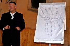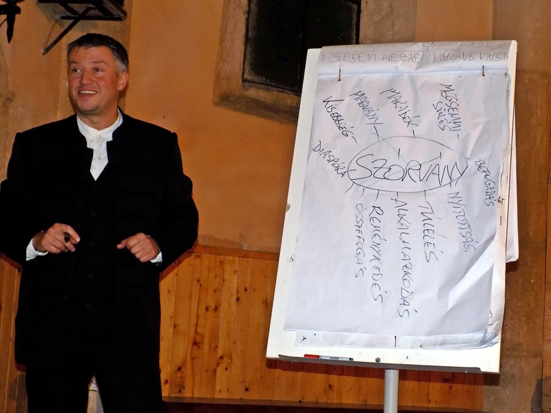 Az énekeket követően Kémenes Lóránt ragadta magához a szót, aki interaktív módon próbálta kibogozni a „szórvány” fogalom mélyebb tartalmát. Mint mondta, levelet kapott az Akadémiától – képzeletben –, miszerint a szórvány szót kilopták a szótárból, és pótolni kellene valami mással. A közönség soraiból érkeztek is a javaslatok szép számban: diaszpóra, magvány, maradék, kisebbség, beolvadás, megsemmisülés, remény, összefogás stb. Majd ezek közül a türi plébános, ugyancsak a hallgatóság javaslatára kiszedte azokat a felvetéseket, amelyek valamiért mégsem illeszkedtek oda. Ezek után csak a tömbmagyarságból származó vendégeket kérdezte meg, hogy ők mit gondolnak: a gondolatpárosítások közül melyikkel nem találkoztak szülőhelyükön? És olyan fogalmak kerültek ki, mint az összefogás, az elfogadás, a nyitottság, a jó értelemben vett alkalmazkodóképesség, a különbözőség. Mindezt azért vezette le így Kémenes Lóránt atya, hogy bemutassa, a szórványban élő magyarok lelkiekben gazdagabbak, akik képesek mindarra, amire a tömbmagyarságban élők csak nagy történelmi szorongatások esetén. Még annyit fűzött az egészhez hozzá, hogy a kisebbség szót nem szereti használni, sőt, elítél mindenkit, aki a szájára veszi, mert a szórványban ugyan számbelileg kevesebben vagyunk, de senkinél nem vagyunk kisebbek, kisebb képességűek.