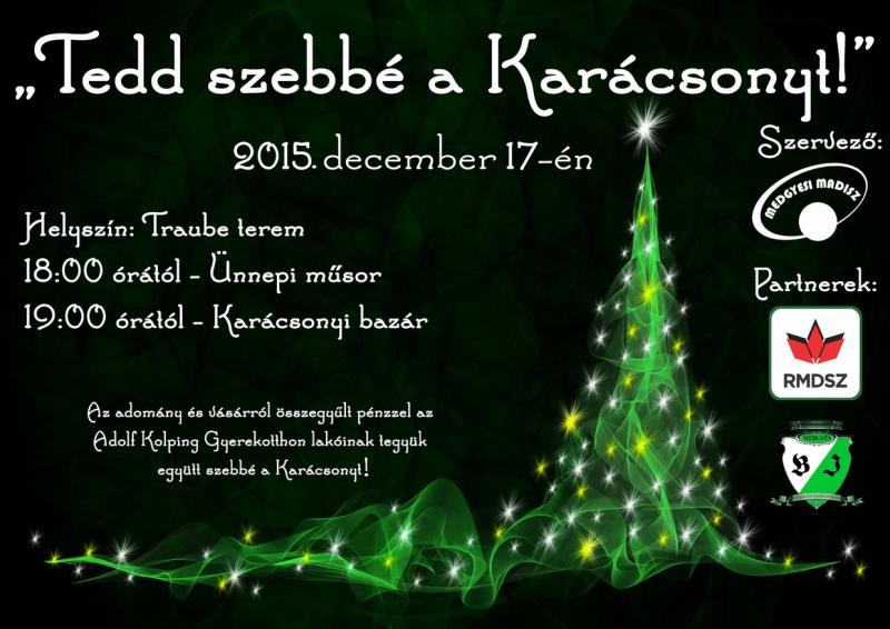A hagyományteremtő karácsonyi ünnepség keretein belül a Báthory István Általános Iskola tanulóinak előadásait, valamint a medgyesi magyar óvodáscsoportok műsorát tekintheti meg a közönség. Az ünnepség után, a gyerekek és a Medgyesi MADISZ önkéntesei által készített ajándékokat, karácsonyi díszeket, apróságokat vásárolhatják meg az érdeklődők a Karácsonyi Vásáron, mely szintén a Traube teremben lesz megrendezve. A vásáron összegyűlt pénzzel, valamint az ünnepségen befolyt adományokkal az Adolf Kolping Gyermekotthon bentlakóit támogatjuk. A gyerekek Karácsonyát együtt tesszük szebbé!