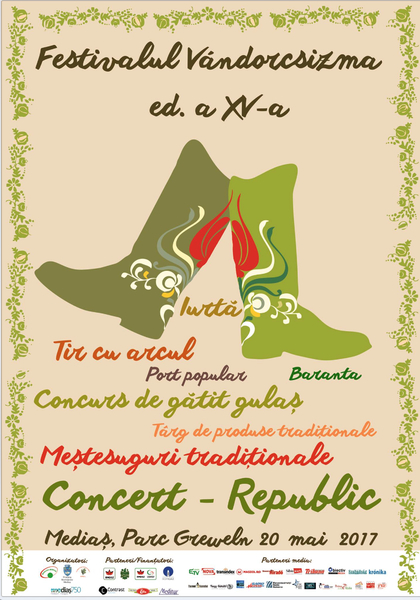 Asociația Tinerilor Maghiari din Mediaș, în colaborare cu Primăria Mediaș și Formația de dansuri populare maghiare Gyöngyvirág, organizează cea de-a 15-a ediție a Festivalului Vándorcsizma, în 20 mai 2017.